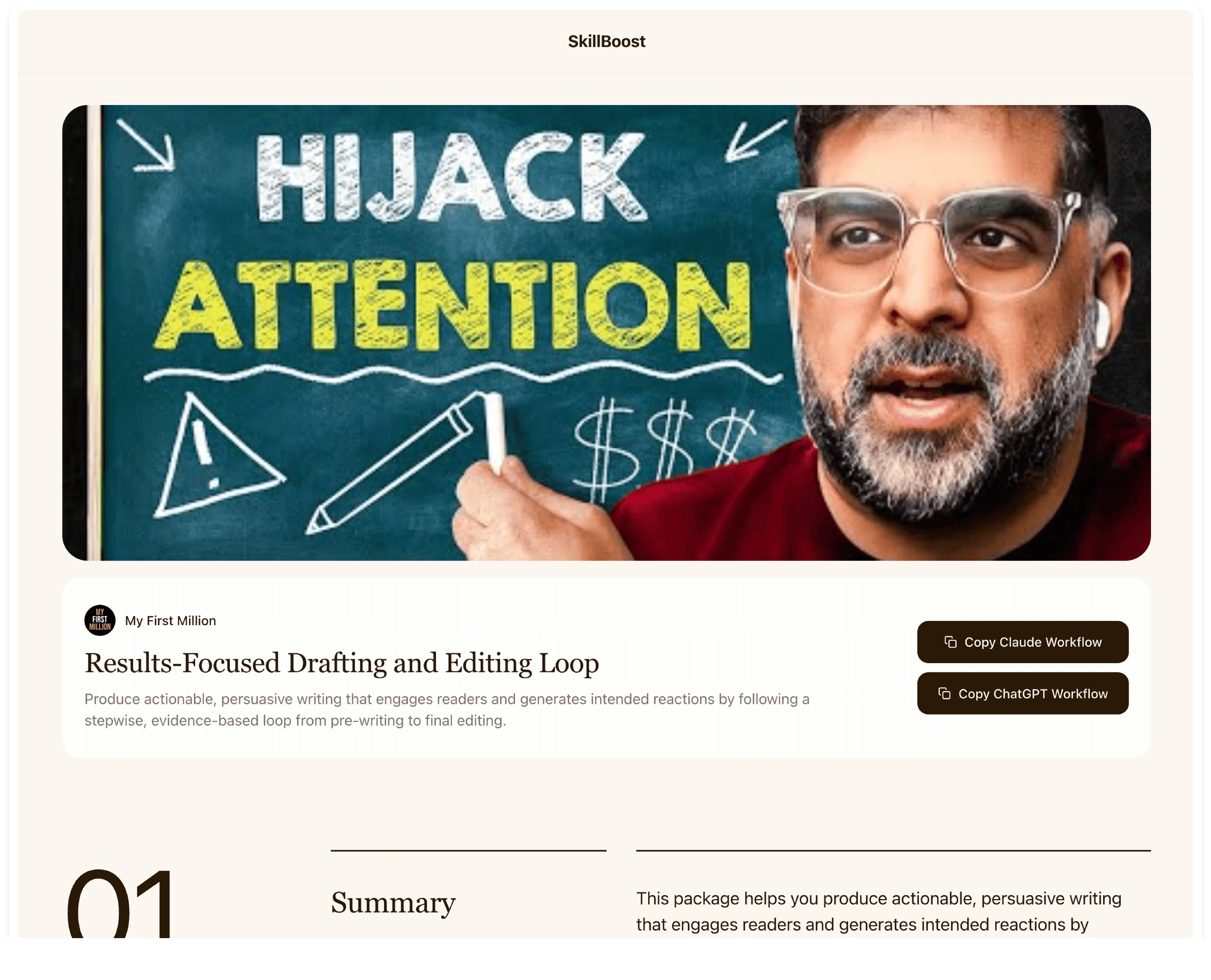 Creators use SkillBoost to transform their YouTube videos into structured skill packages and workflows. Subscribers copy-paste them into Claude or ChatGPT and apply their strategies immediately.